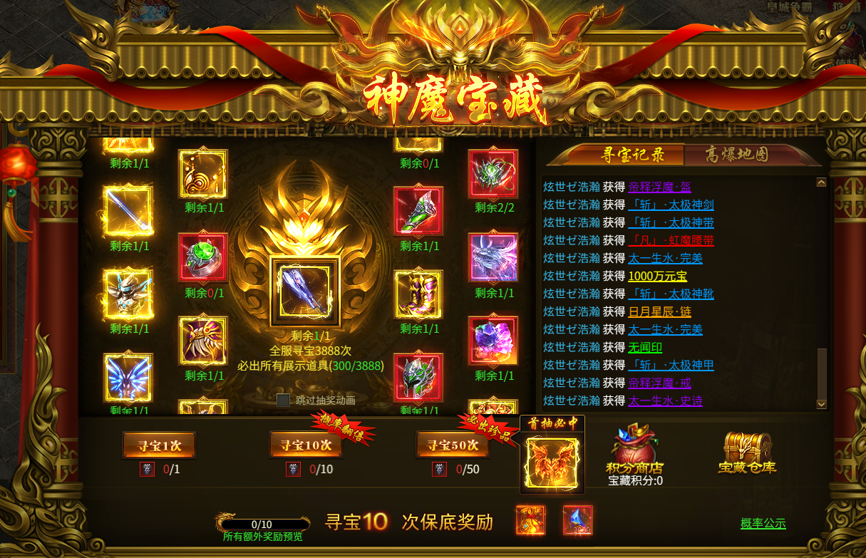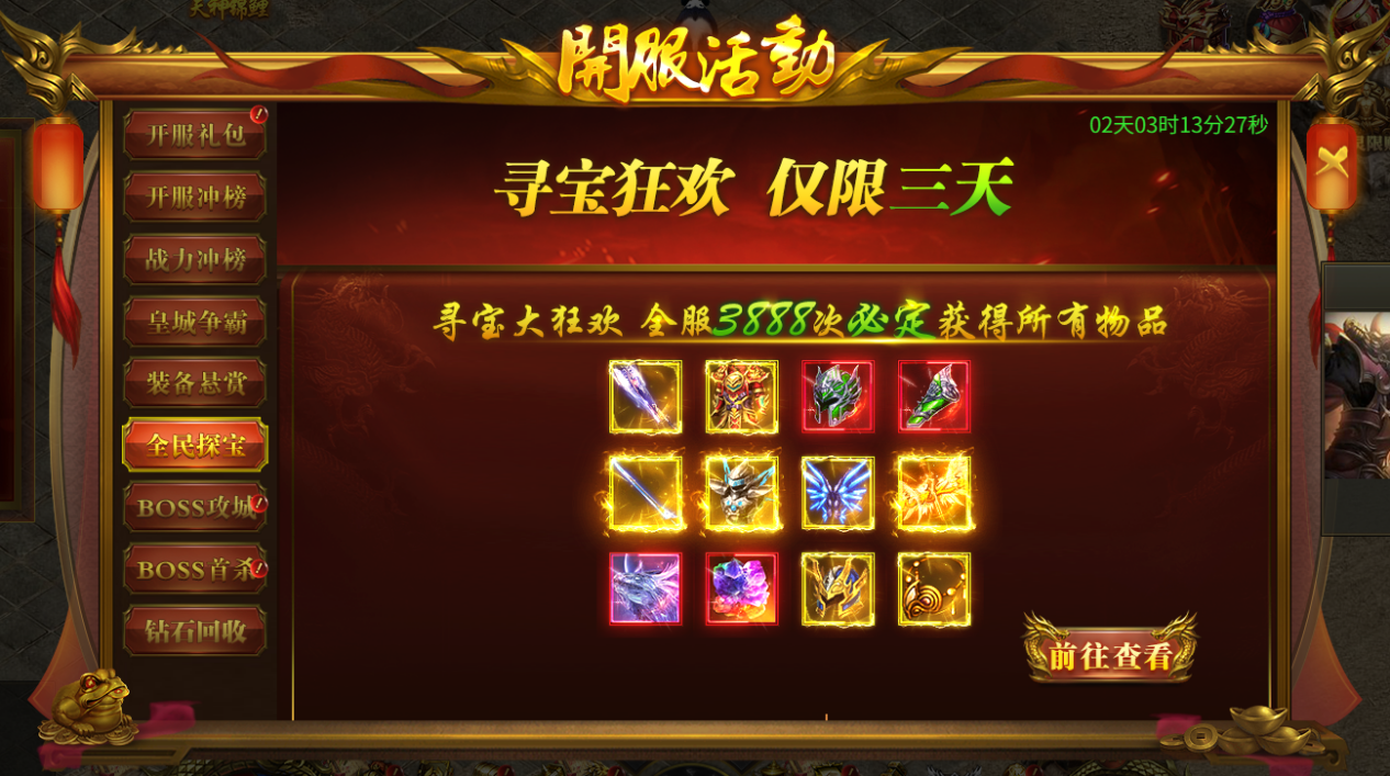 活动内容:开服第三天开启,每次寻宝都奖励,寻宝10次可获得保底奖励。
