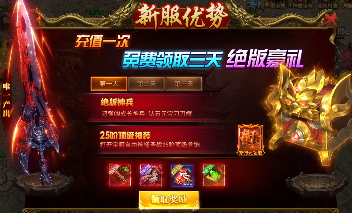 第一天:GM·超级神兵,灵宠貂蝉,元宝袋*100,等级直升丹*1