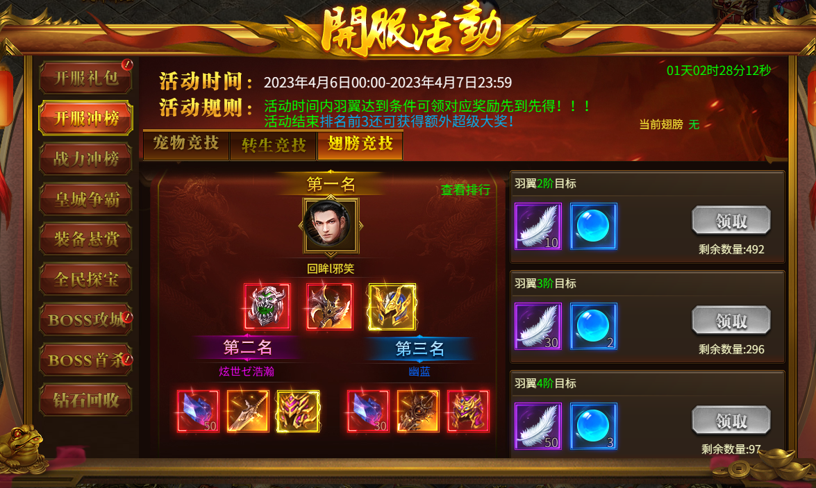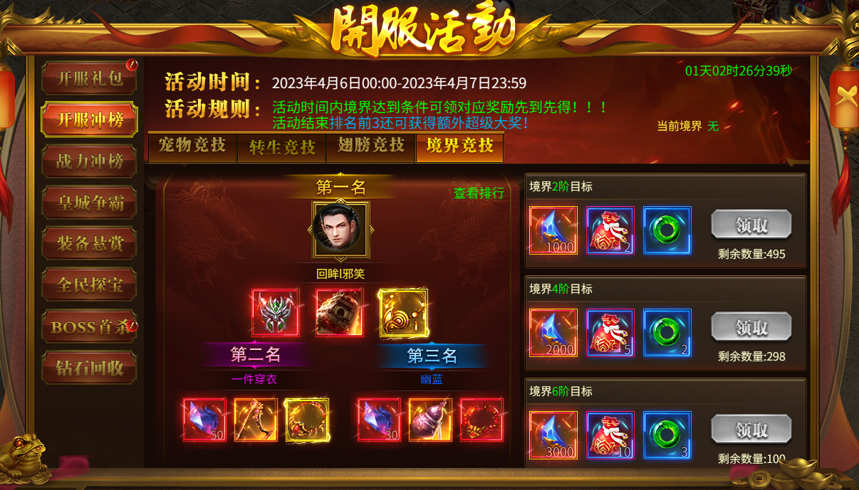 活动内容:开服前5天,每天开启一个冲榜活动,角色满足指定条件即可领取超多丰厚奖励