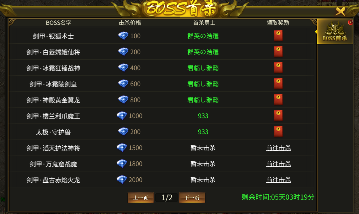 活动内容:首次击杀对应BOSS可以获得元宝奖励
