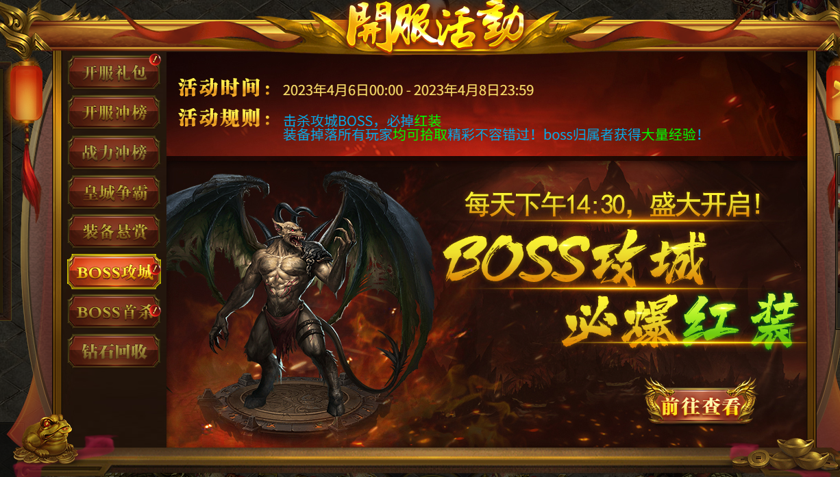 活动内容:开服3天,每天下午14:30BOSS攻城必爆红装