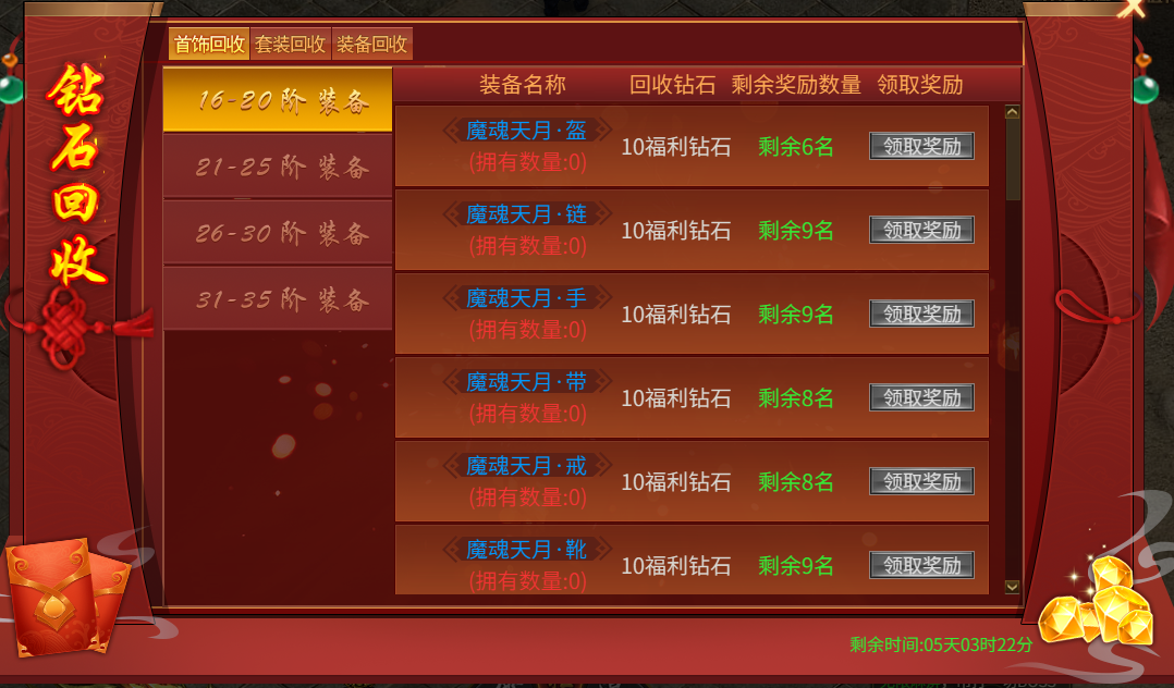活动内容:活动时间内回收装备可获得大量钻石奖励