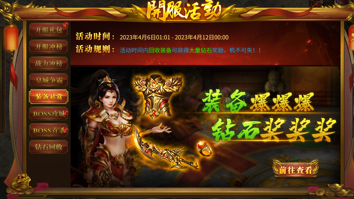 活动内容:开服第四天开启皇城争霸 占领皇城行会额外获得20000钻石奖励